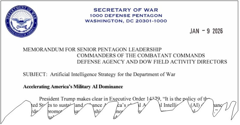 “President Trump makes clear in Executive Order 14179, “It is the policy of the United States to sustain and enhance America’s global Artificial Intelligence (AI) dominance in order to promote human flourishing, economic competitiveness, and national security.” In the national security domain, AI-enabled warfare and AI-enabled capability development will re-define the character of military affairs over the next decade. This transformation is a race - fueled by the accelerating pace of commercial AI innovation coming out of America’s private sector. The United States Military must build on its lead over our adversaries in integrating this technology, established during President Trump’s first term, to make our Warfighters more lethal and efficient. To this end, aligned with America’s AI Action Plan, I direct the Department of War to accelerate America’s Military AI Dominance by becoming an “AI-first” warfighting force across all components, from front to back.”