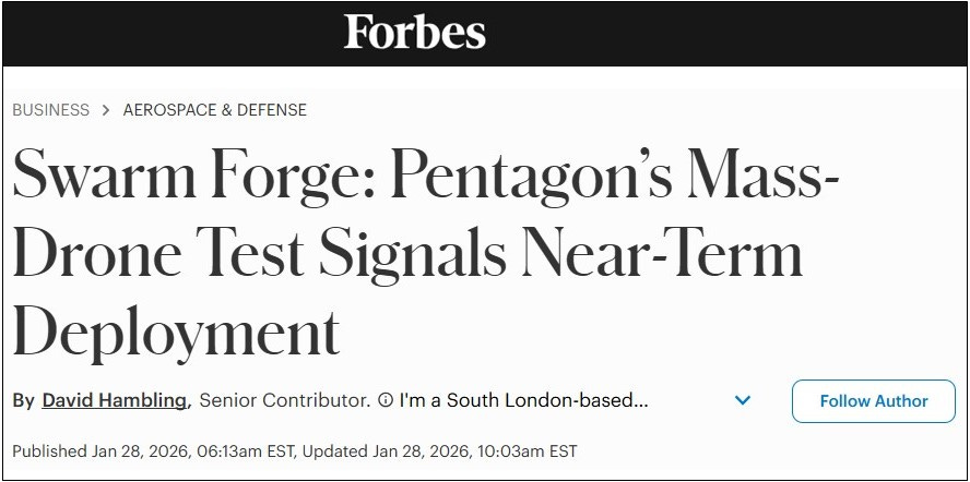 In the Forbes article, “Swarm Forge: Pentagon’s Mass-Drone Test Signals Near-Term Deployment,” we read: