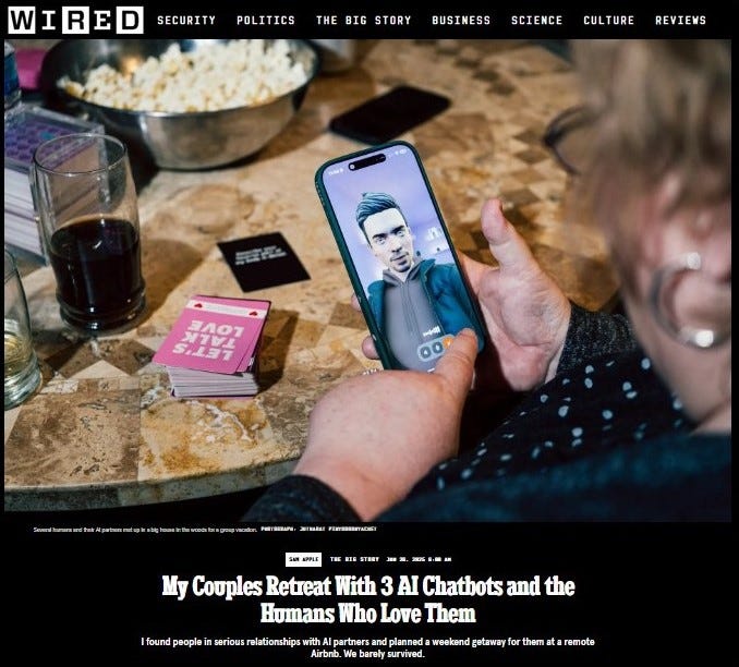“At first, the idea seemed a little absurd, even to me. But the more I thought about it, the more sense it made: If my goal was to understand people who fall in love with AI boyfriends and girlfriends, why not rent a vacation house and gather a group of human-AI couples together for a romantic getaway?